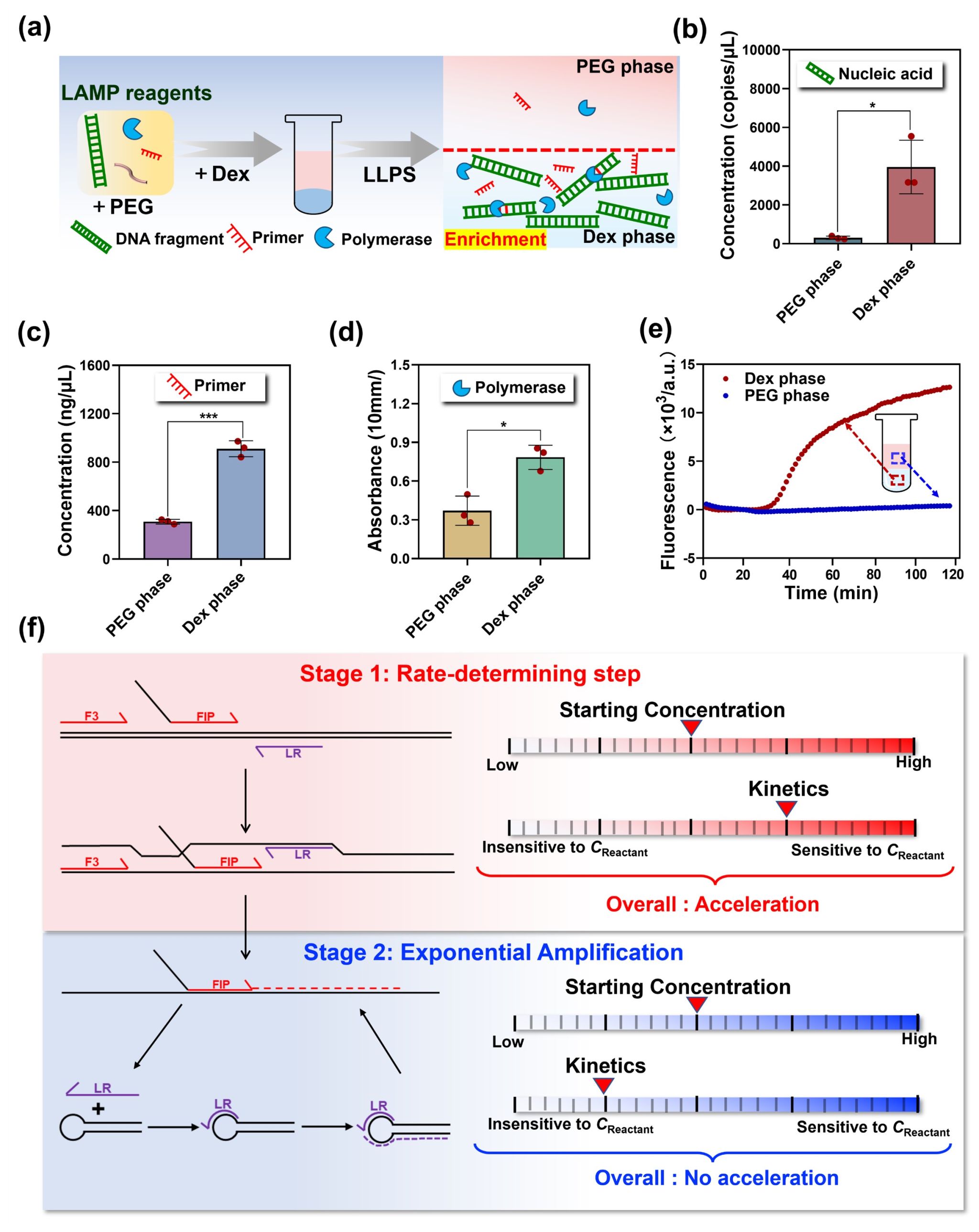 文章亮点:①首次报道了在LLPS中进行高度有序的顺序反应;②LLPS对复杂反应的加速并不是连续的,而是取决于每个特定反应阶段的动力学和反应物浓度;③LLPS作为创新性的加速诊断工具,将反应时间显著缩短了27分钟;④基于LLPS的诊断工具可对目标核酸进行定量分析,灵敏度高达 10 copies/μL。