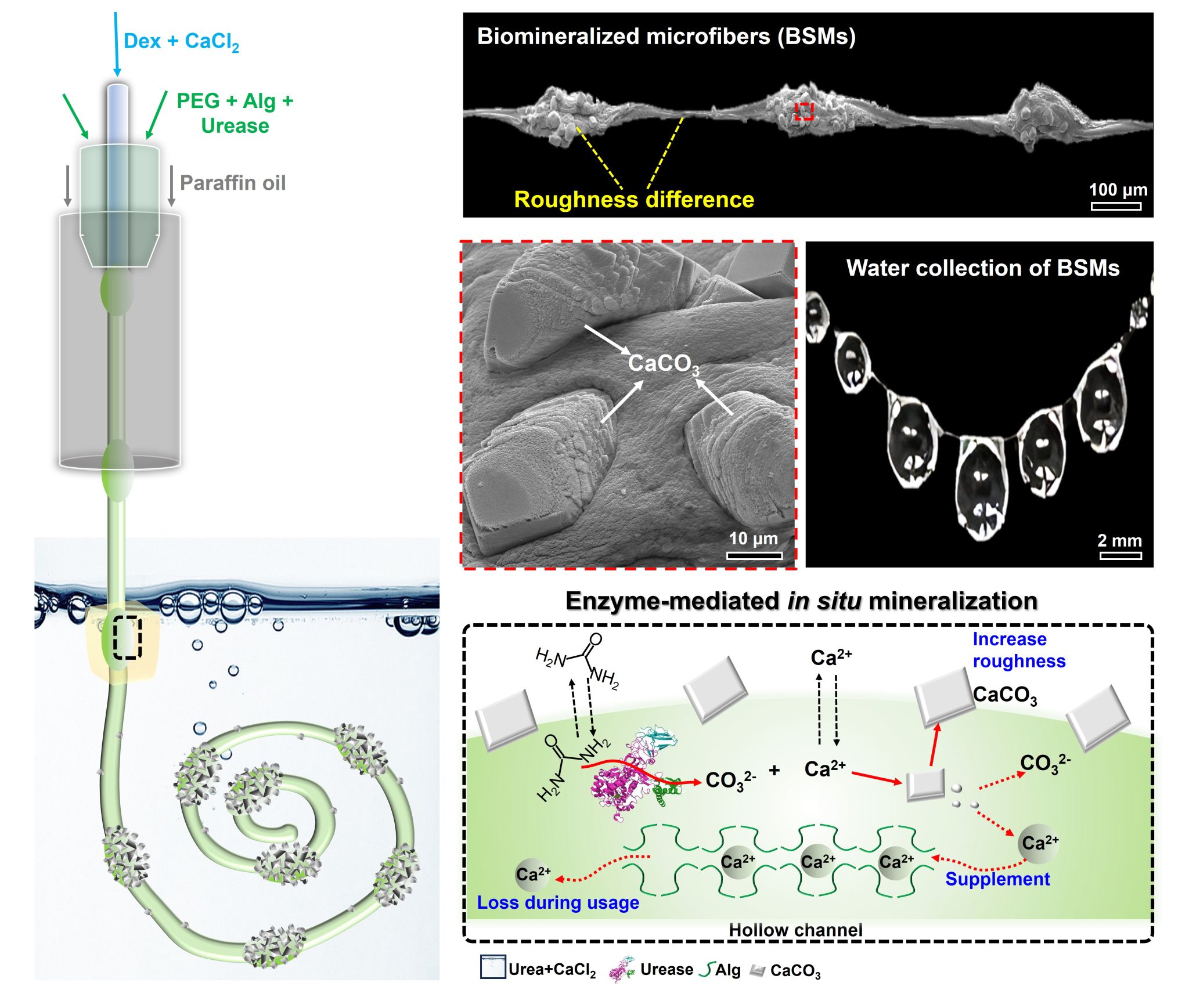 受蛛丝从自然雾气中集水的启发,亲水纺锤节超细纤维作为一种有价值的水收集工具以缓解淡水短缺。然而,目前最易获得的生物基人造蛛丝的耐用性和集水效率较低,由于水的反复浸泡造成形变,使其失去了持续集水的能力。在本研究中,我们开发一种利用酶介导原位仿生物矿化的微流控方法,构建具有粗糙纺锤节的海藻酸钙微纤维(BSMs),以增强生物基微纤维的集水效率和耐用性。在微纤维内策略性地空间定位负载酶,使矿化过程主要发生在纺锤节处,这使得纺锤节与连接纤维之间形成明显的表面粗糙度差异,从而提高水收集效率。此外,酶介导反应产生的CaCO3颗粒还牢固地锚定在纤维内部,在集水过程中补充流失的Ca2+,增强该微纤维的耐用性达到108次。