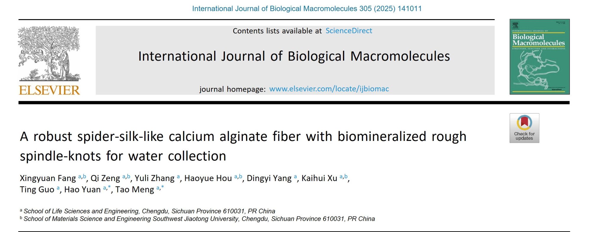 近期,生物学杂志《International Journal of Biological Macromolecules》(JCR,Q1区,2024影响因子8.5)报道了我校“微纳生物技术”创新团队的研究成果“A robust spider-silk-like calcium alginate fiber with biomineralized rough spindle-knots for water collection”。论文第一作者为js33333金沙线路检测2024级博士生方兴元,通讯作者为苑昊老师和孟涛老师,西南交通大学为唯一署名单位和通讯作者单位。