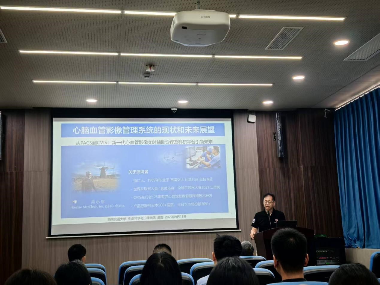 2025年9月15日上午,js33333金沙线路检测创源大讲堂研究生学术讲座在工业中心C103会议室举行。本次讲座主题为“心脑血管影像管理系统的现状和未来展望”,特邀心血管影像信息系统资深专家、Hawkie MediTech, Inc.创始人兼CEO、我校1985届校友吴小朋先生担任主讲。基于其25年的行业经验,他为师生带来了一场深度与前瞻性并存的学术分享。