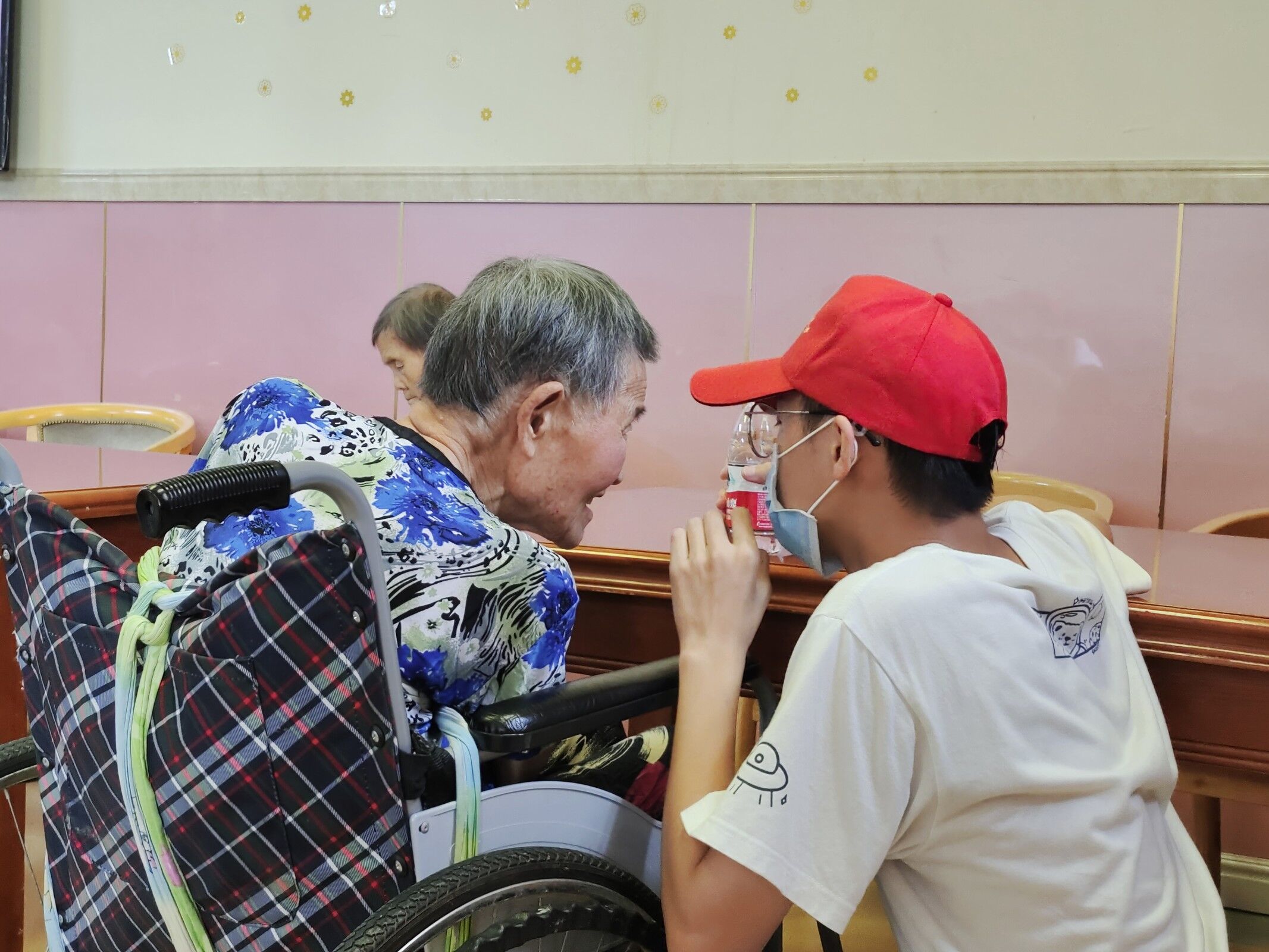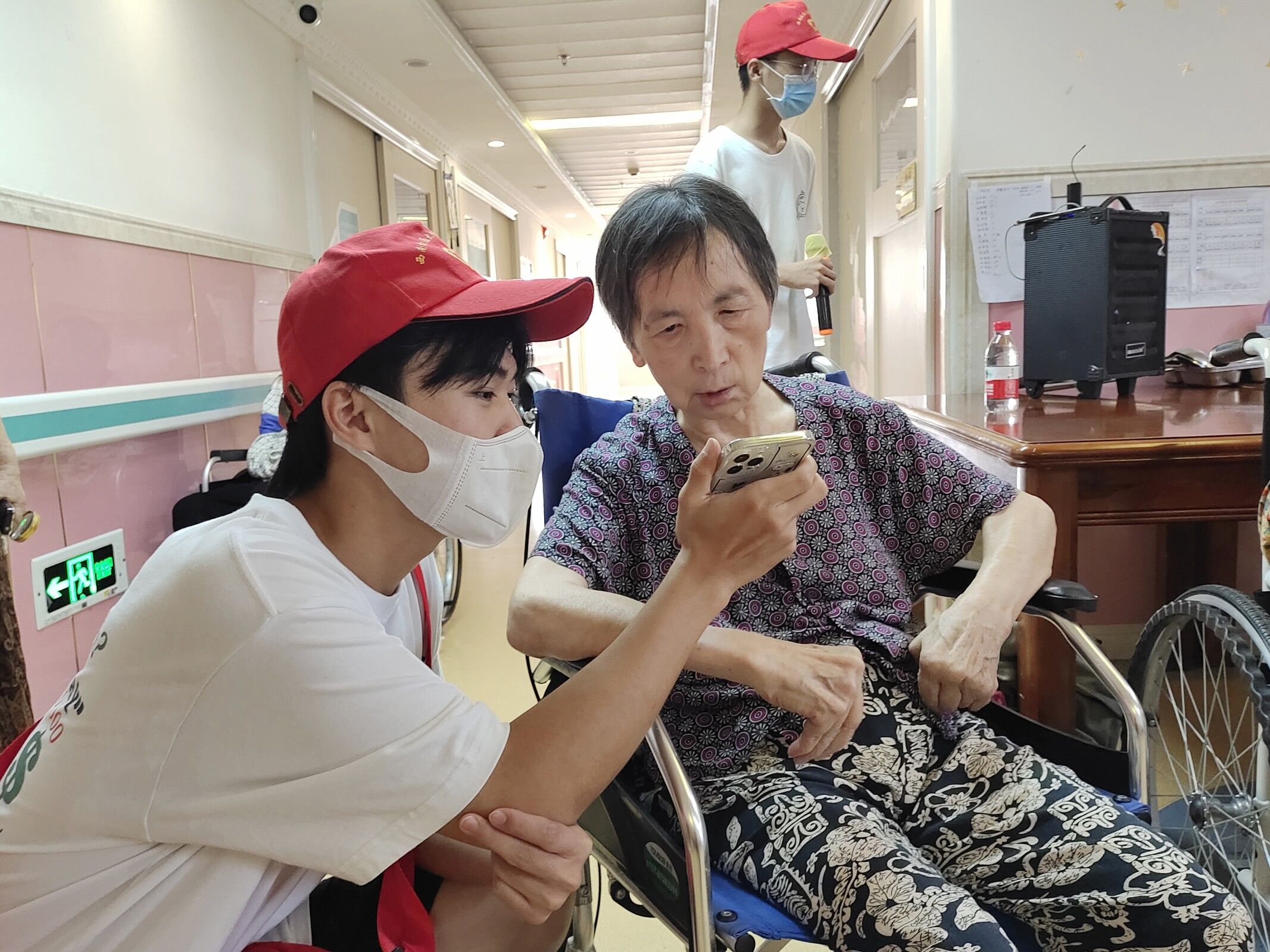 志愿者到达养老院后,经过简单的交接,工作人员将志愿者分配给不同的护工,护工向志愿者介绍了他们的日常工作并给志愿者们安排了简单的清扫工作,让志愿者们拿着毛巾去清理栏杆和板凳上面的灰尘,或是擦拭玻璃。在完成这些任务后,由于新颐园养老院还在扩建装修,在养老院的场地内堆放了许多废弃的垃圾,志愿者们又在工作人员的带领下,去院子里捡拾垃圾,让养老院的环境变得更加整洁和舒适。此次去的三个养老院的面积虽然都算不上很大,但相应的配套设施一应俱全,走过浓密树木下的林荫小道,可以看到不少老人在这乘凉,交谈声中也不时流露出欢声笑语。志愿者们前往老人们的居住区,在工作人员的帮助下,志愿者们成功地在老人们面前表演了简化太极拳,同时也合唱了《我和我的祖国》《茉莉花》等经典歌曲,引起许多老人小声跟唱,表演结束后,养老院里也响起了热烈的掌声。不难看出,志愿者们的演出深受老人们的喜爱,为老人们的生活增添了一份别样的色彩。在文艺表演结束过后,青年志愿者们相继分散开来,就近与身边的老人聊天,老人们敞开心扉讲述自己的故事,志愿者在一旁认真倾听,让老人们感受到温暖的陪伴。志愿者和老人们的相处十分融洽,欢声笑语回荡在整个养老院。时光转瞬即逝,在短短的几天内,青年志愿者们与老人们建立了浓厚的友谊,最后在老人们不舍的目光中,志愿者们结束了行程。