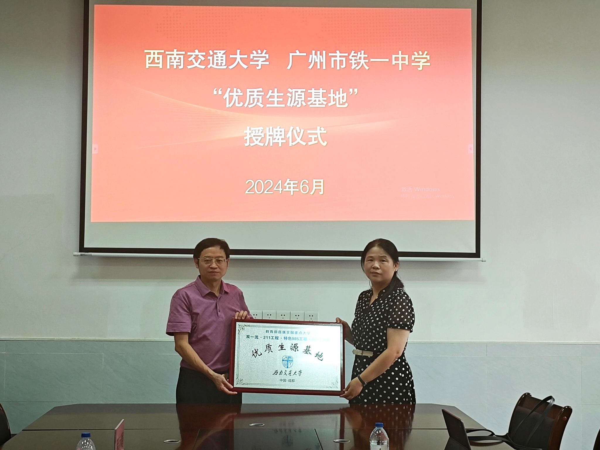 6月23日,js3333线路检测中心党委书记黄春蓉带队,专业教师徐柳、辅导员许青一行3人前往广州市铁一中学越秀校区、番禺校区进行招生宣传。期间,与广州市铁一中学校长黄连生、办公室副主任程丽娟就学校概况、生源情况、高考情况等开展了座谈交流,并举行了西南交通大学-广州市铁一中学“优质生源基地”挂牌仪式。
