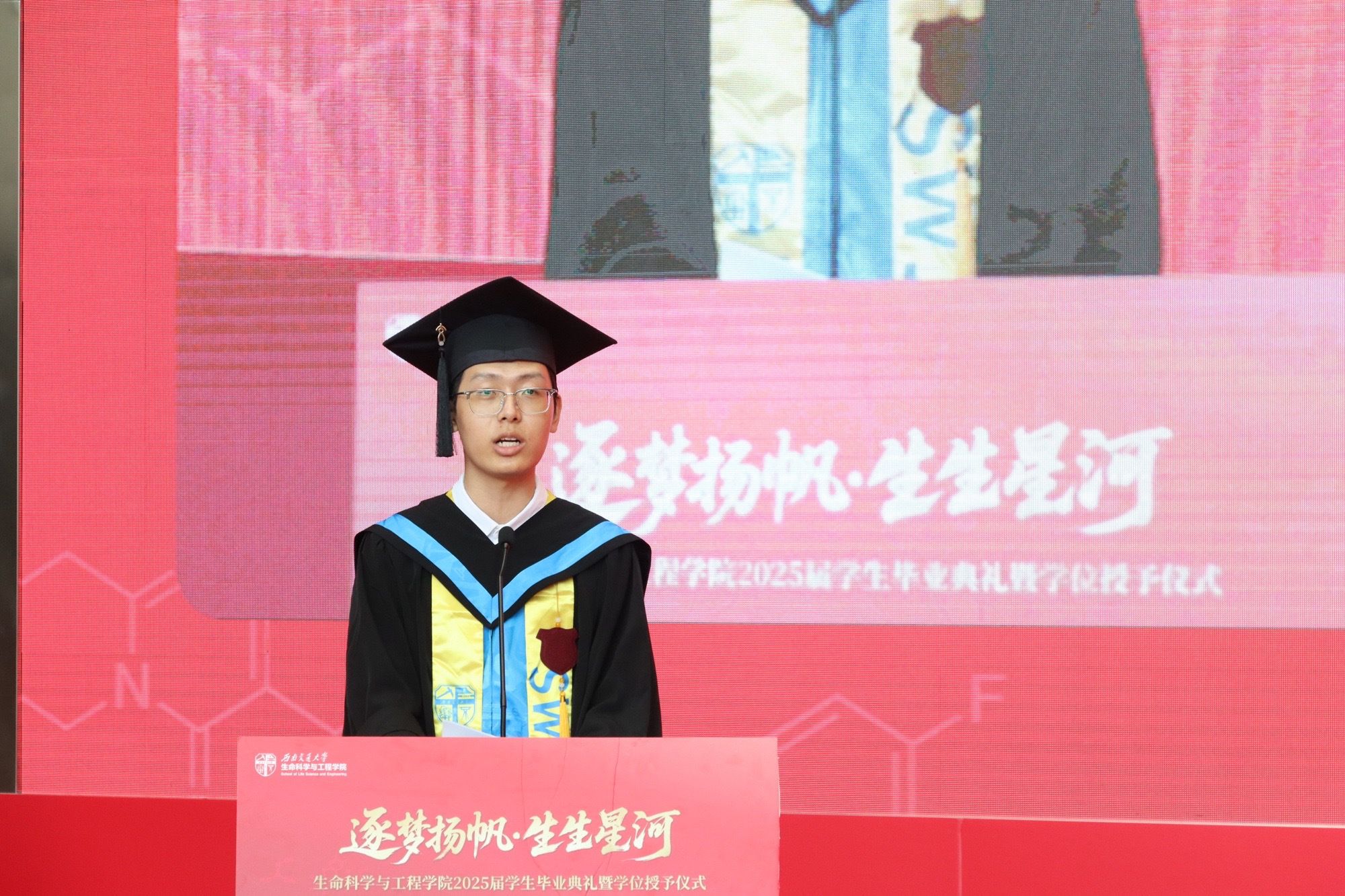 教师代表廖海教授结合自身科研经历,为毕业生送上“人生四课”:毕业是终身学习的新起点,要持续向身边人学习;坚持锻炼保持身心健康;常怀感恩之心;学会欣赏人生风景,在奋斗路上不忘善待自己。毕业生代表陈豪、王嘉莉同学动情回忆了求学时光,感恩学院培养,表示将用实际行动践行新时代交大生命人的使命担当。