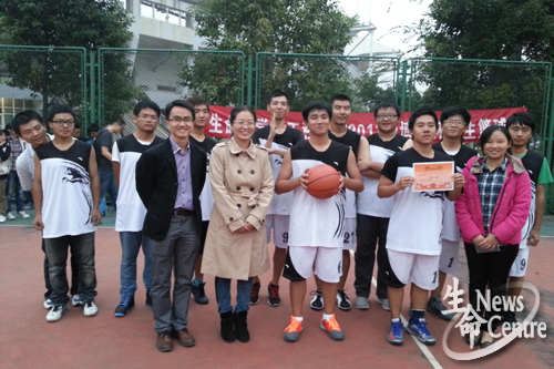 9月27日下午5:40,js33333金沙线路检测2013级“博远杯”新生篮球赛总决赛——生工一班与四班在北区篮球场展开最终冠亚军角逐。js3333线路检测中心党委副书记罗妍妍老师,团委书记、11级辅导员崔健老师,13级辅导员高鹏老师亲临现场观看比赛。