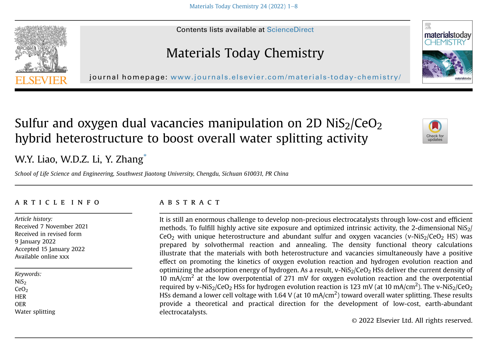 我院张颜老师在化学领域TOP期刊Materials Today Chemistry发表最新研究成果