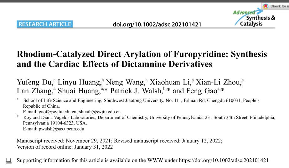 2022-03-03近日,有机化学领域权威期刊 《Advanced Synthesis & Catalysis》 (IF = 5.837)报道了我院“小分子天然药物” 团队的研究成果“Rhodiu...
